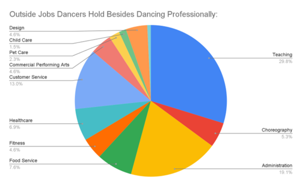 We also asked about what other jobs dancers held outside of their companies besides dancing professionally. Teaching (29.8%) was again the largest percentage with administration coming in a close 2nd (19.1%). Interestingly, food service was 7.6% which differs from the public perception of artists and dancers in general. However, customer service was the 3rd largest percentage of outside jobs. This makes sense since minimum wage work offers flexible scheduling and has a low point of entry (not needing many years of experience or a particular college degree).