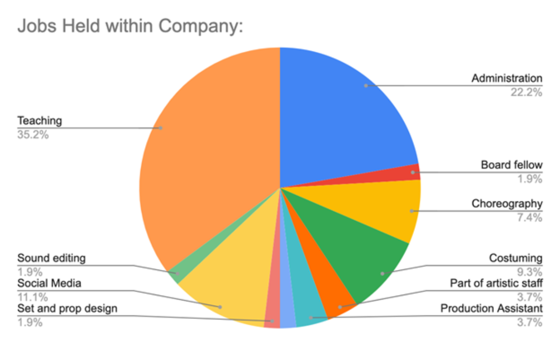In addition to performing, many dancers hold additional positions with their respective companies that could develop skills leading to opportunities beyond their performance career. We found that dancers mostly held teaching jobs for the company (35.2%) which makes sense considering most companies offer classes alongside their performance programming.