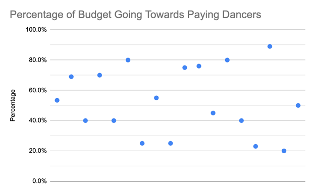 Over half the companies have at least half their budget or more going directly to dancer pay. Smaller companies that have less expenses (venue rentals, administrative staff, rent or mortgages on property, marketing agencies, grant writers, costume designers, lighting designers, set designers, etc.) are more likely to have a higher percentage of their budget going towards dancer pay.